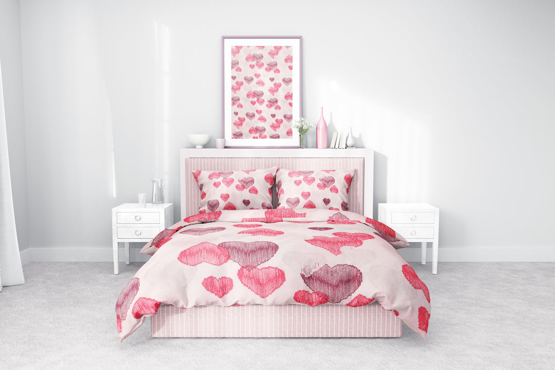 Pembe Kalp Desenli Pamuklu Nevresim Takımı | Lastikli Çarşaflı