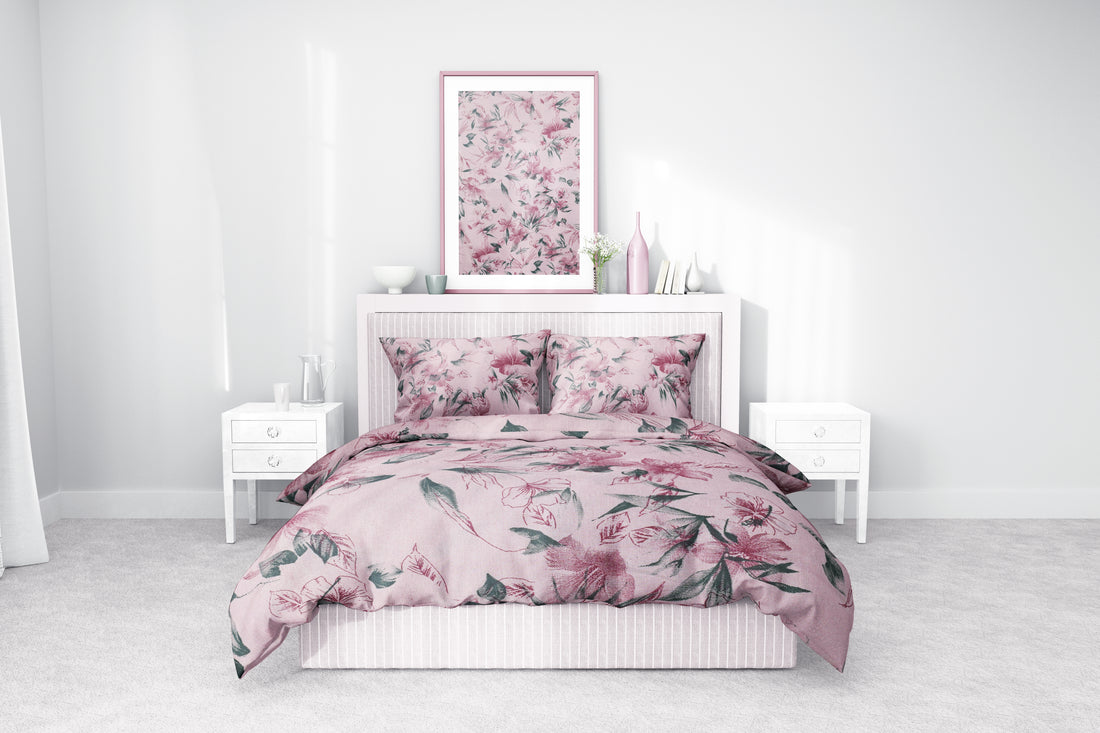Pudra Pembe Çiçek Desenli Pamuklu Nevresim Takımı | Lastikli Çarşaflı