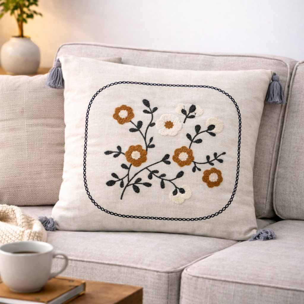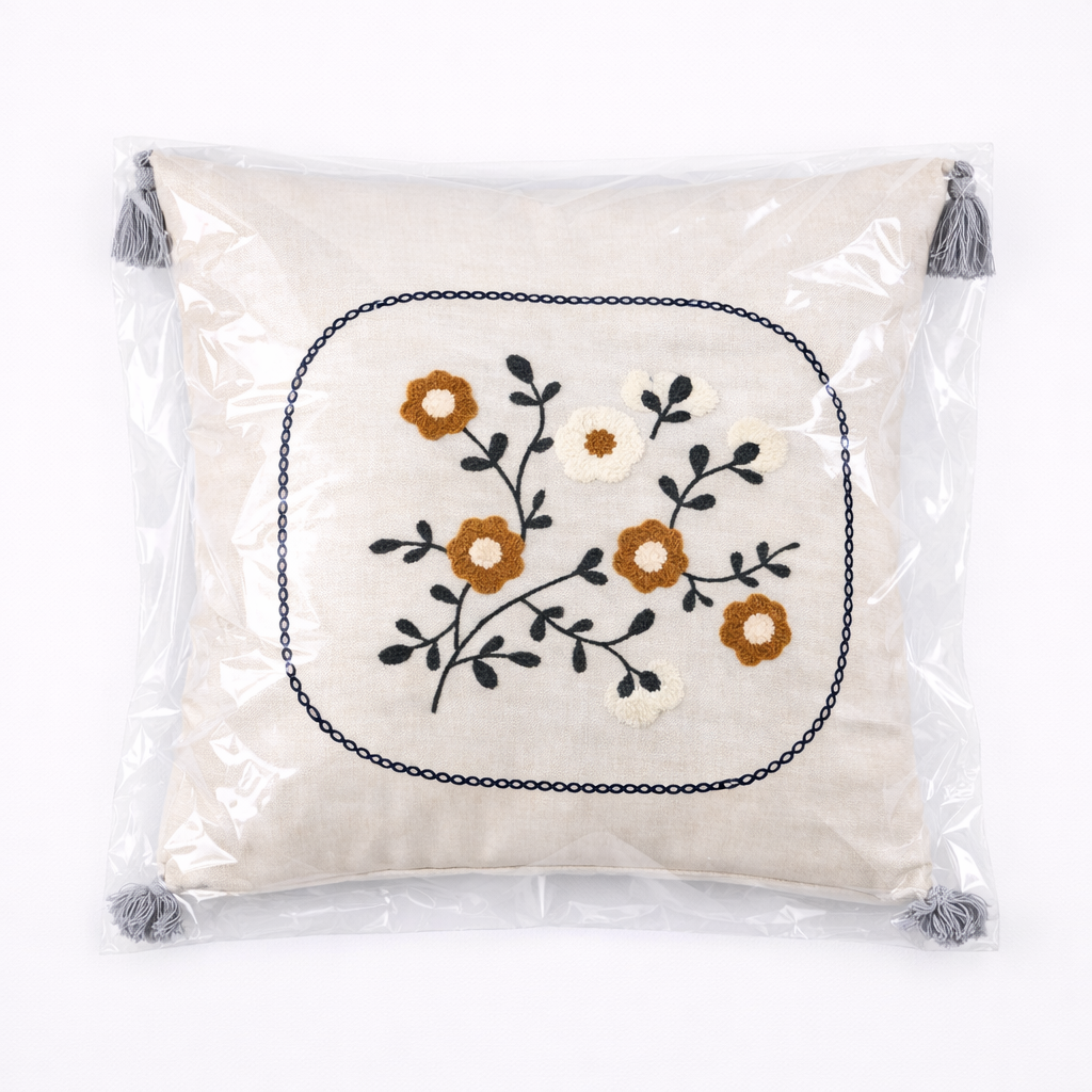 Nakışlı Çiçek Dalı Desenli Dekoratif Kırlent Kılıfı | Püsküllü Yastık